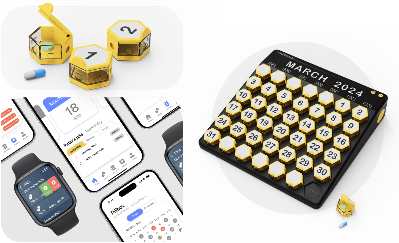 Each container features an e-ink display that changes display to indicate whether pills have been taken, providing visual reassurance at a glance.