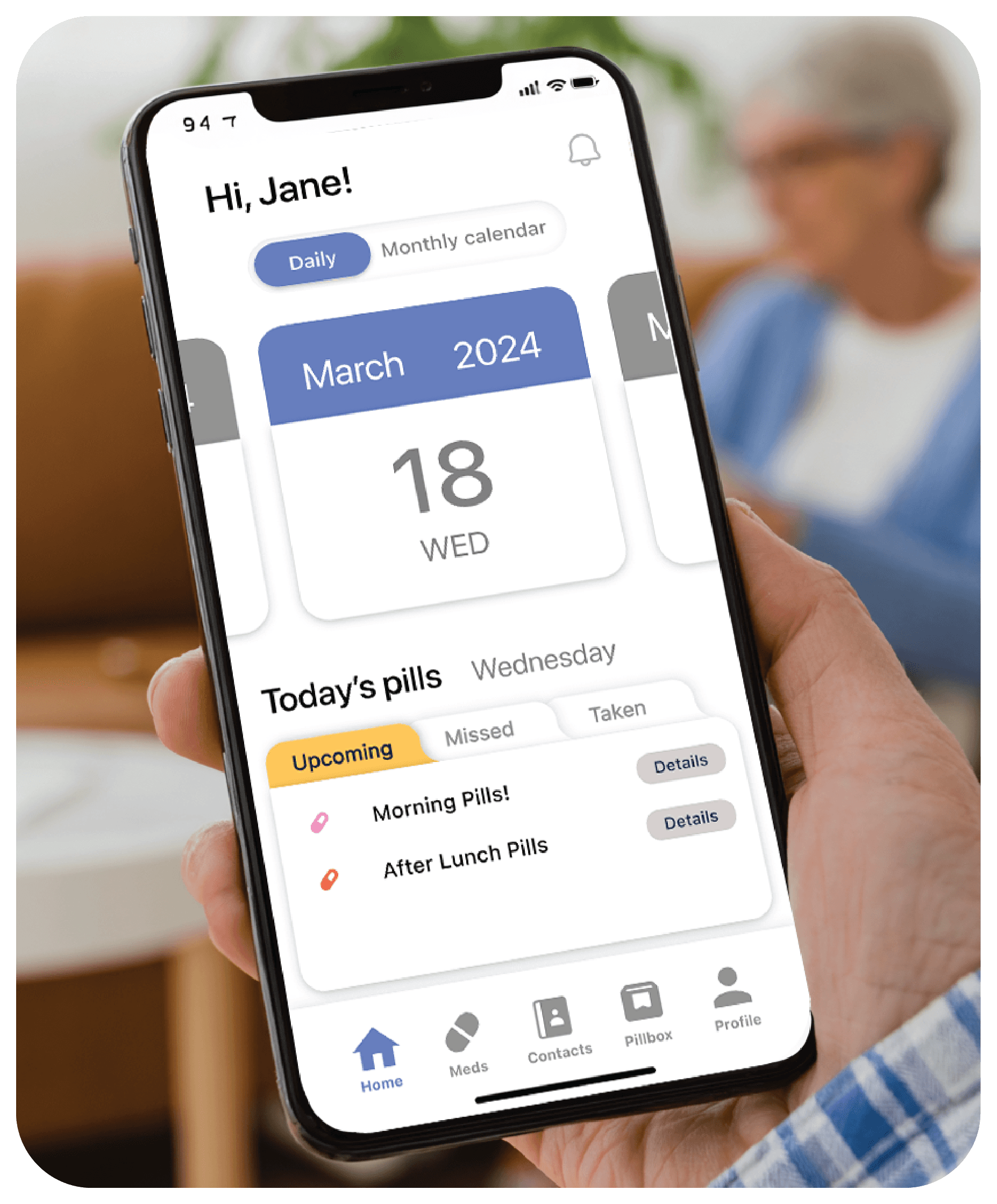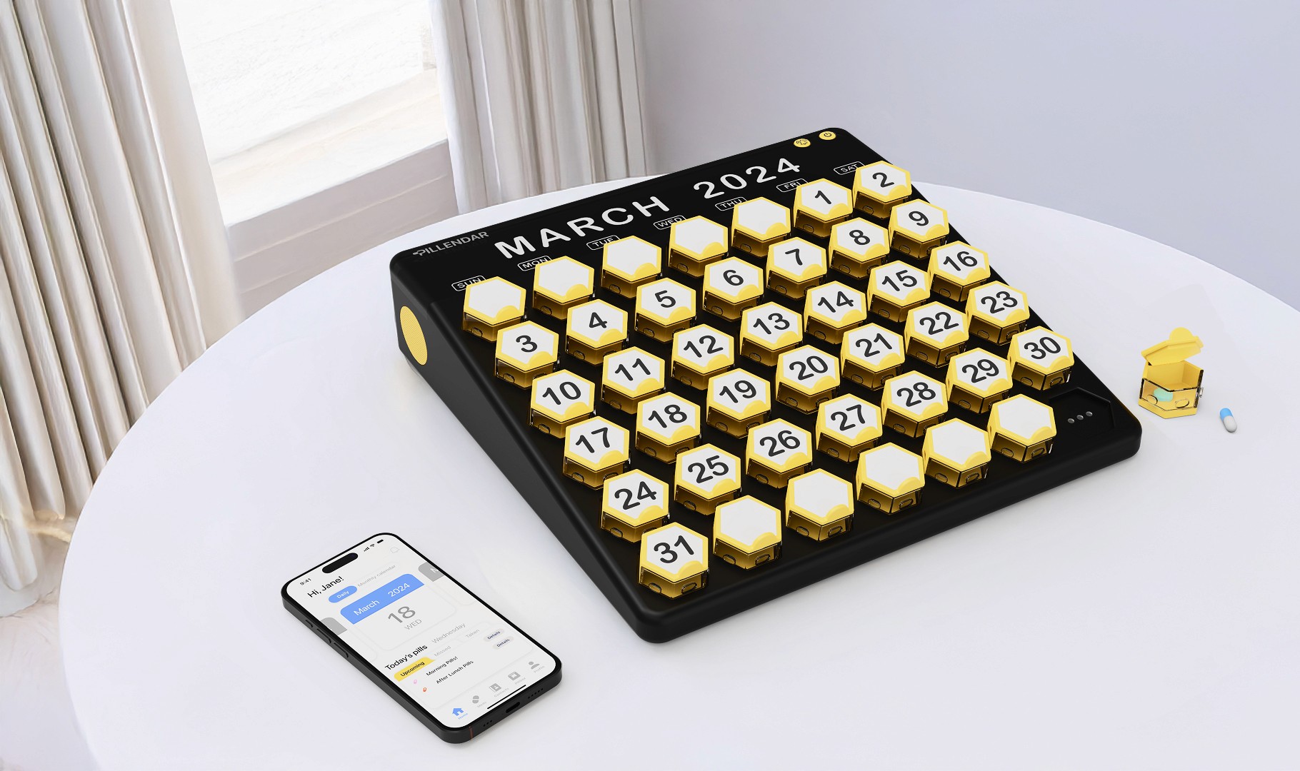 Dedicated Pillbox Tab: Connected to the app via Bluetooth.